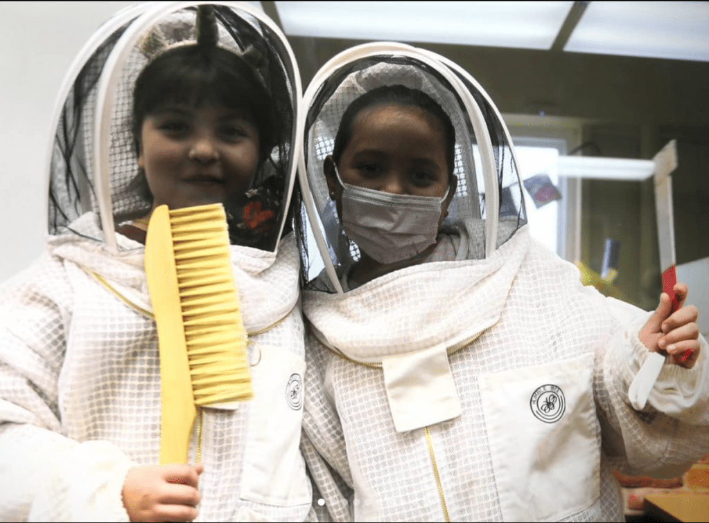 -Beekeeper suits and bee box tools for the students to try on and pose for a photo in.