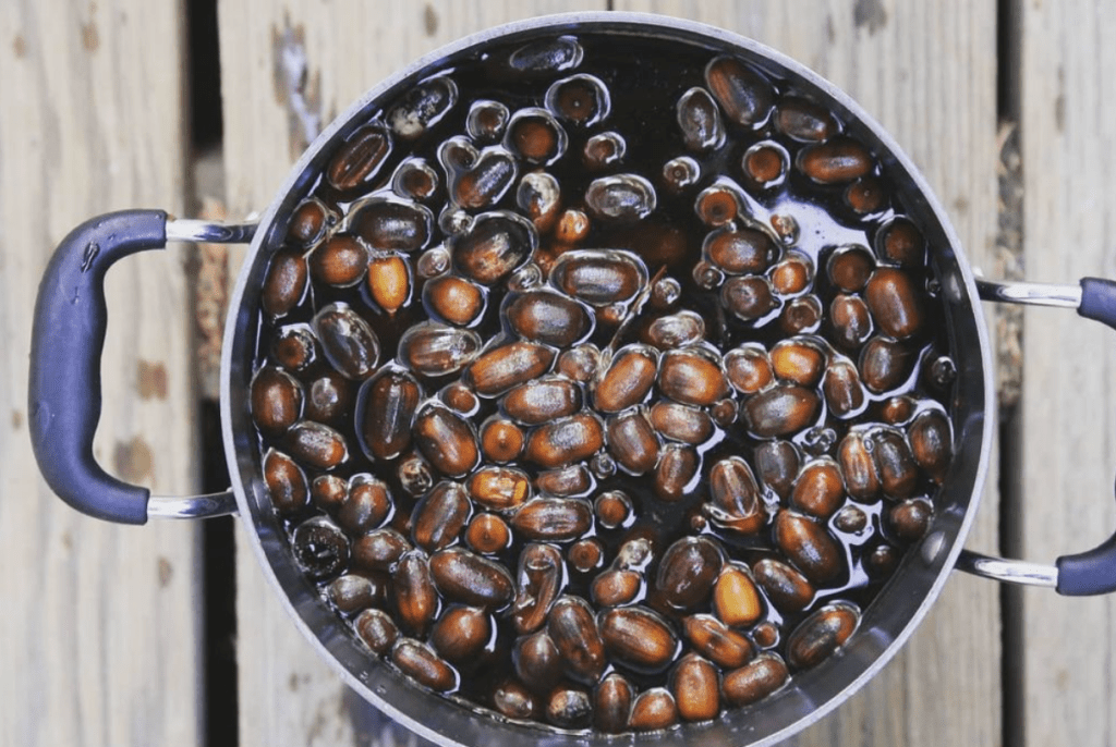 Mati hosted a natural dying class taught by a local expert and friend, who encouraged her to use what she learned in garden class. So the next week Mati took kids out on campus to look for acorns.