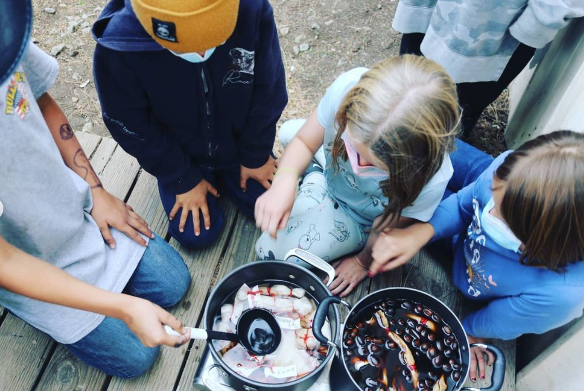 After the acorns simmered, Mati taught them to mix iron post mordant and experiment with dipping and adding contrast.