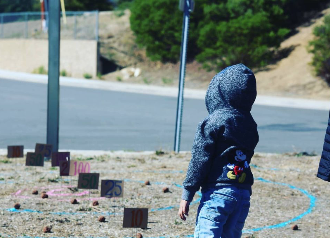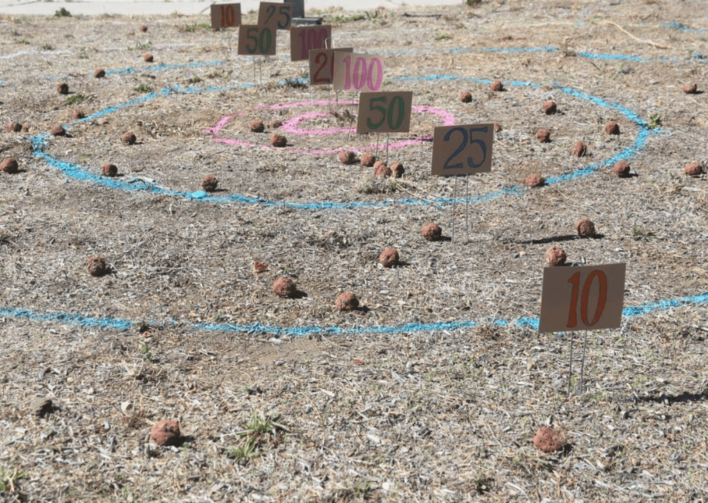 Then she created a “skee ball” court out on an unused piece of ground in front of the school. Remember skee ball? You throw balls at targets to get points, at the fair or arcade. (Fun element #2!)