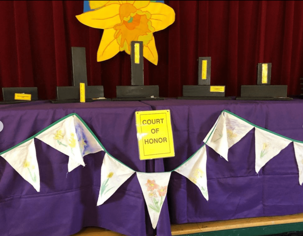 And finally, the flags were assembled to hang at Town Hall for last weekend’s daffodil show! (More on that in the next post…stay tuned.)