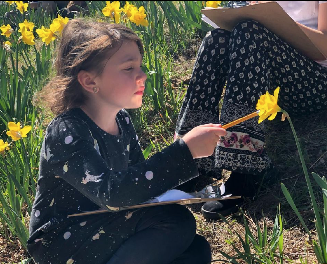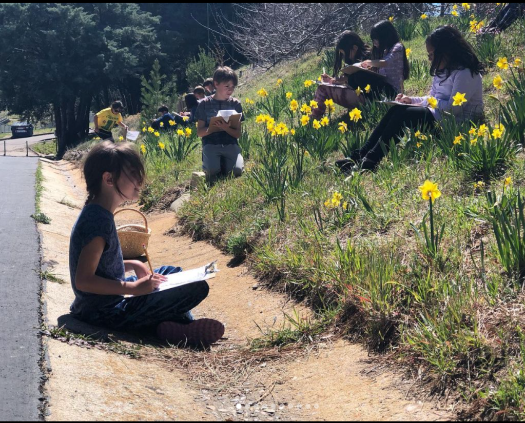 I know, I know. Amazing. (Mural on campus, perhaps?) Mati created many lessons around our treasured daffodil season. The first activity was for students to spread out in the garden and sketch and color the flowers for a pennant.