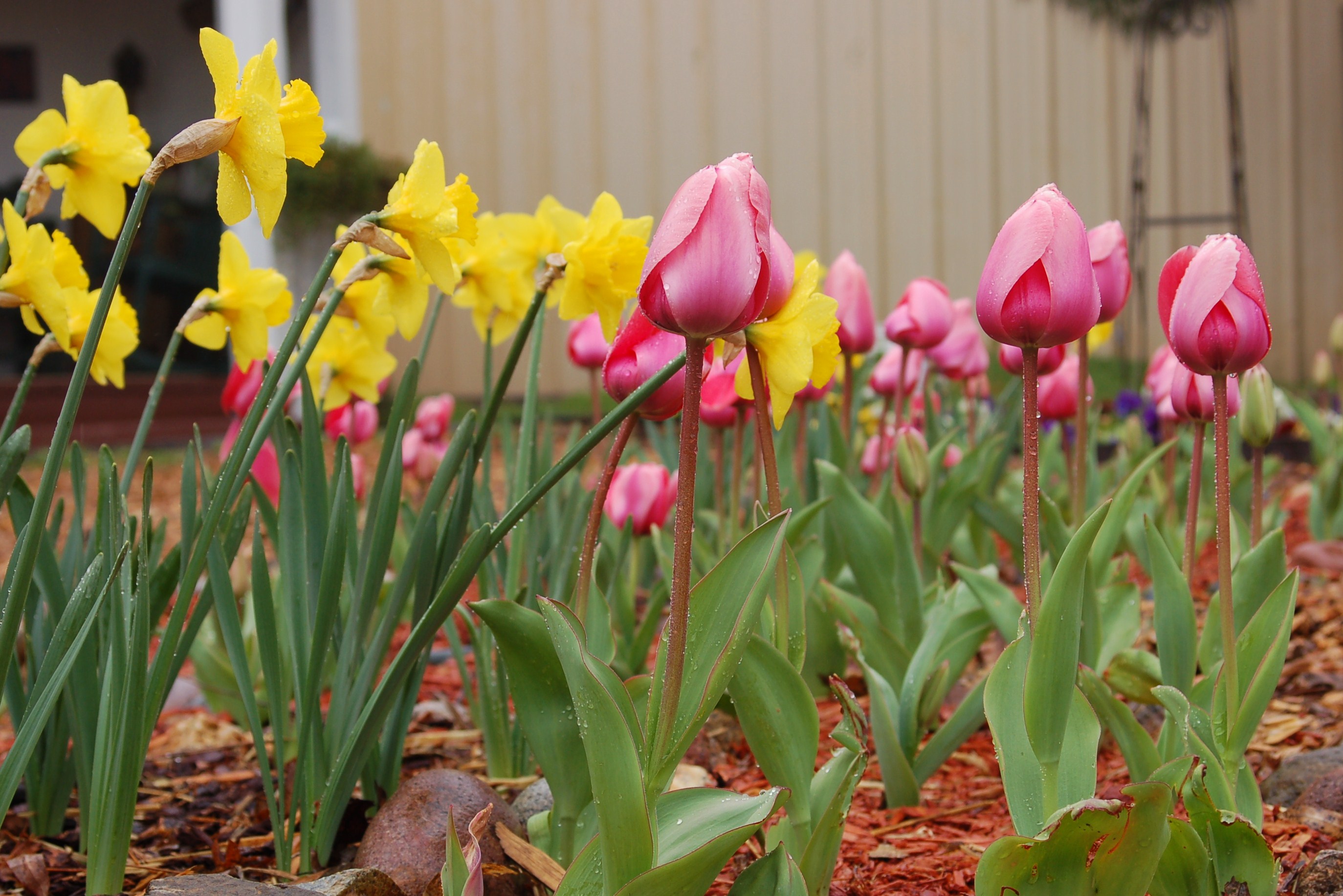 It is one of the most beautiful elements of our garden, and it is starting to come up this week.  The ribbon is mulched with red bark and lined with stone.  Daffodils are planted in the center of the ribbon.