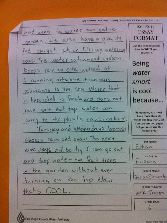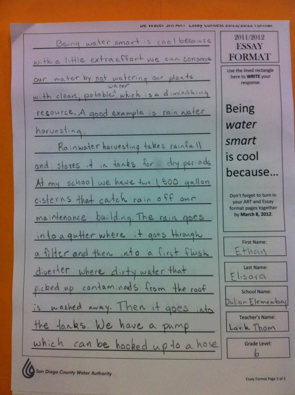 1. Congratulations, Ethan! I really enjoyed your essay. You did a great job describing the system and also covered the reasons we want to conserve water very well. That is so important because many people don’t realize how everyone can help make a difference!