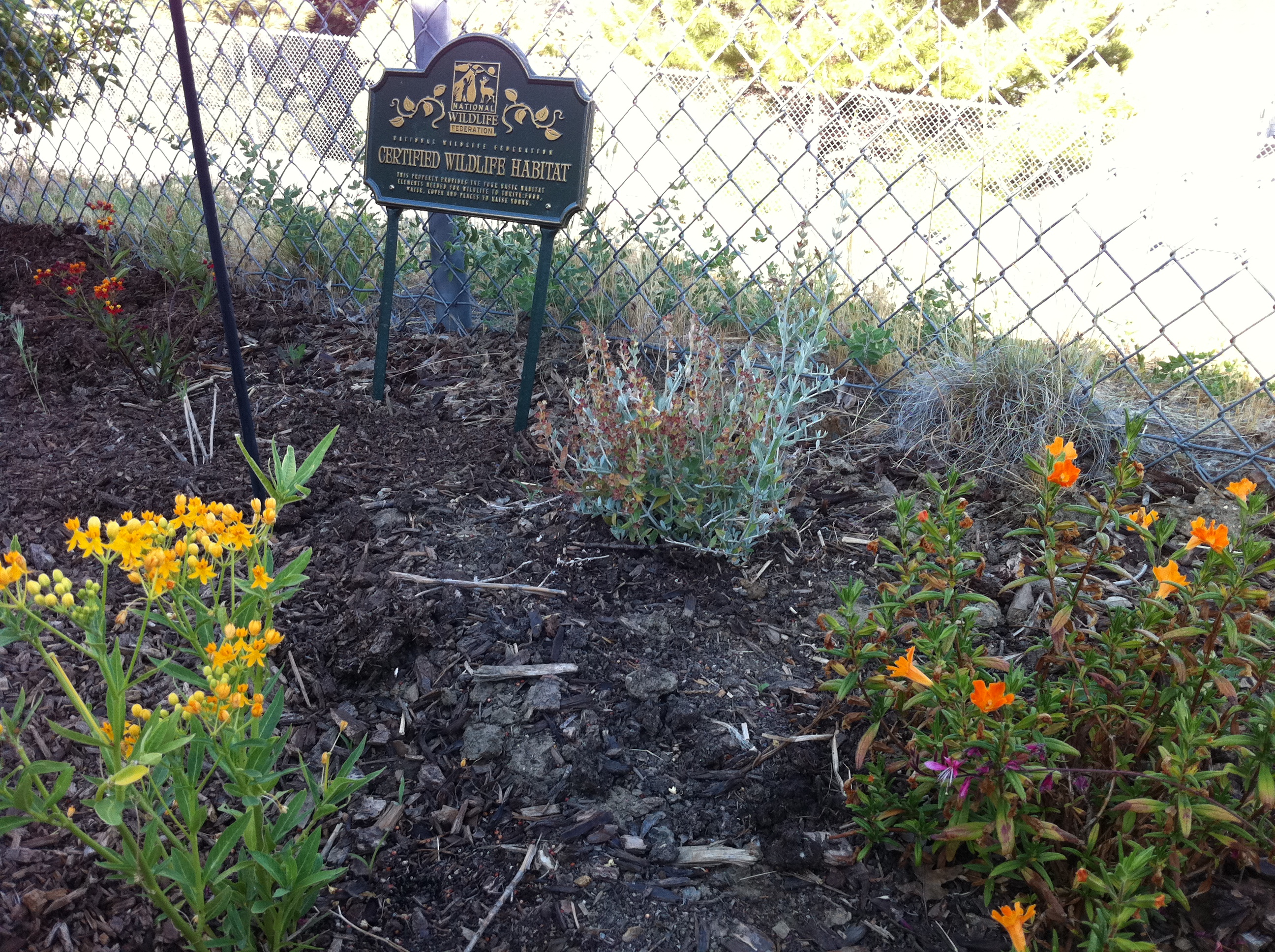 Did you know you can register your backyard as a “certified wildlife habitat” through the National Wildlife Foundation?  Or your schoolyard?  If you have the four elements of habitat, and can show that you garden in an environmentally friendly way, you can earn this distinction.  You can then display a NWF sign, which can help educate others about the elements of habitat that people can provide for wildlife in our own backyards (no matter how small) and school grounds.