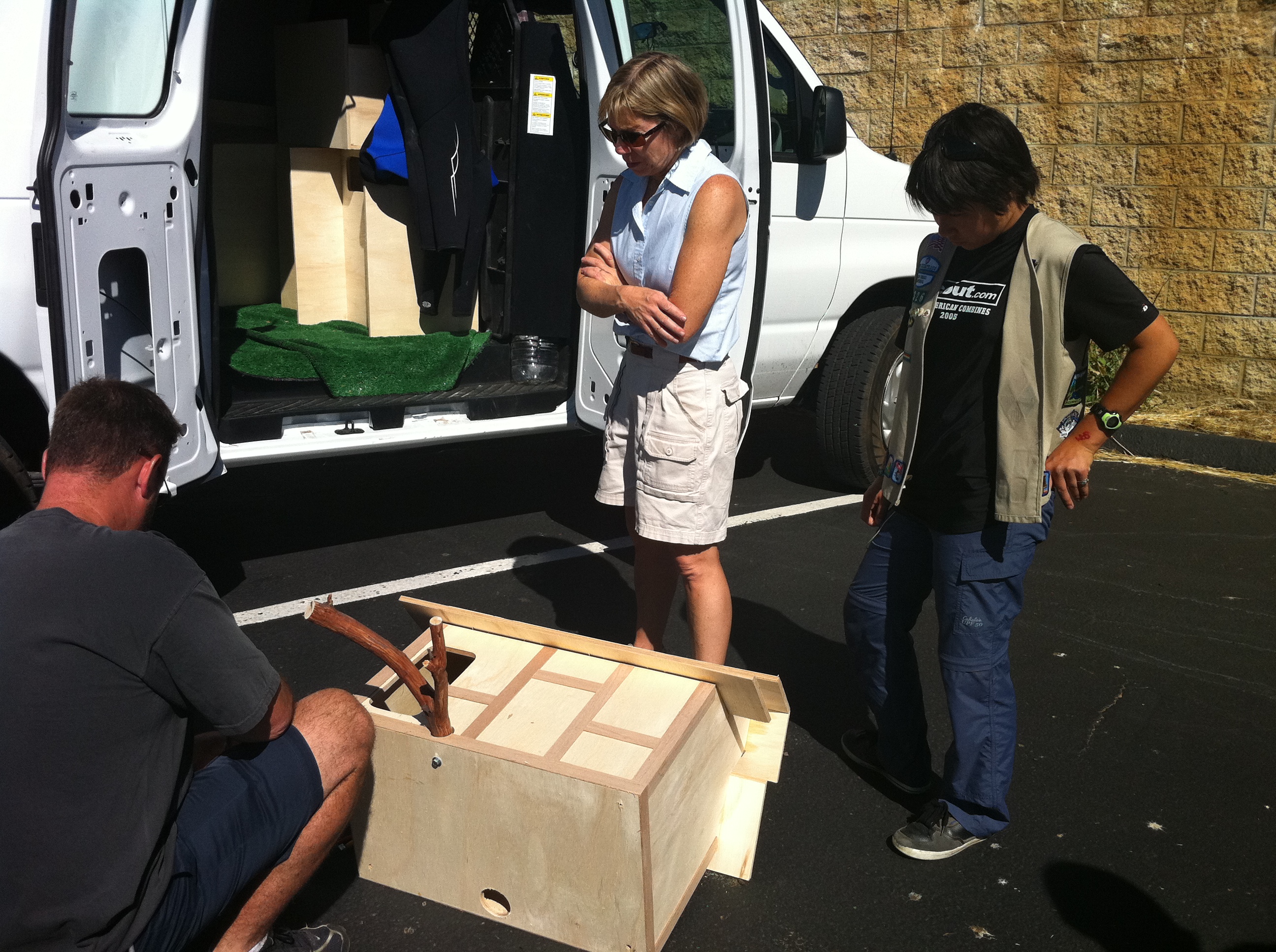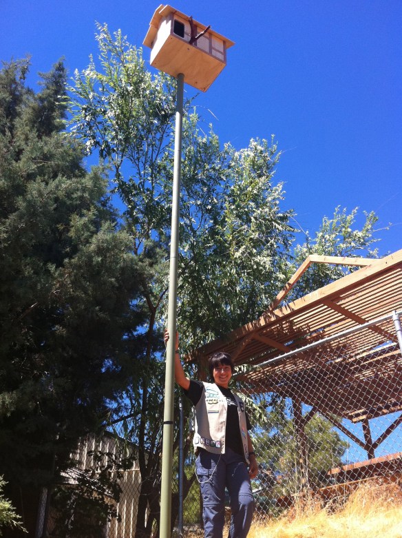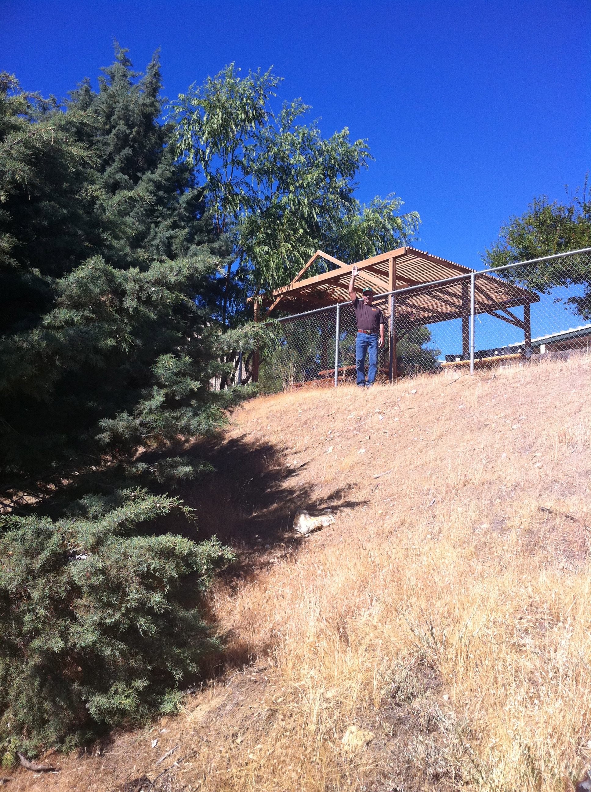 Tom Stephens from Air Superiority in Ramona below, scoping out the best place for the box. This spot was chosen because it’s north-facing, overlooks a flat “hunting” area (the junior high fields), and is protected on the backside by a stand of trees. This is the slope that edges the garden (you can see the pergola in the background.)