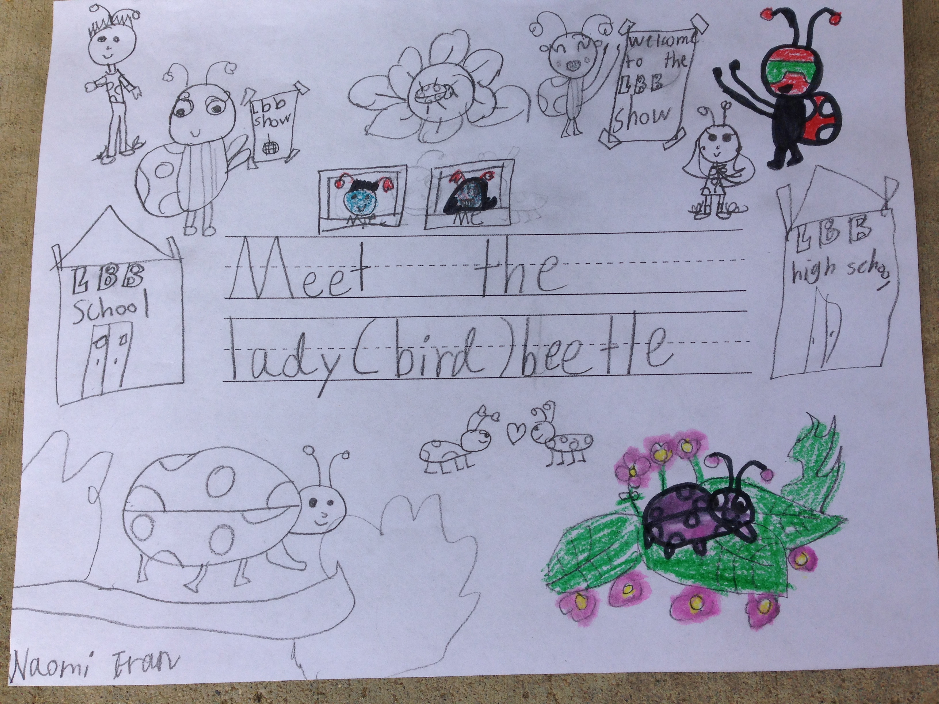 I began with a mini-lesson on the difference between true bugs and beetles, followed by all of the astonishing facts and figures about the volume and diversity of beetles on earth. Then I passed out a blank sheet and a template of cartoons, and the kids copied this sentence and had fun embellishing their papers with either their own designs or copies of the cartoons.