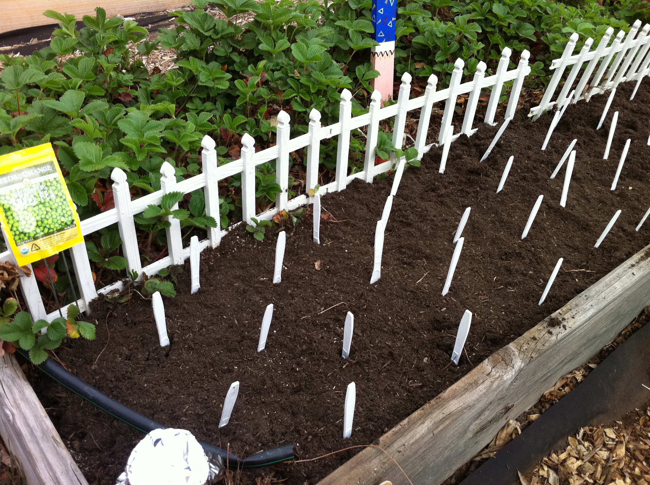 When you don’t have a lot of time to plant, and you want things to be relatively well spaced, I’ve discovered the beauty of plastic cutlery. These little knives (very unsharp) were put in the bed before kids arrived. Then kids were told to take a knife, swirl it around to make the correct planting depth, drop in the seed, and cover it back up with soil. Then they discarded the knife in a pot. Then we remember that a particular spot was already planted.