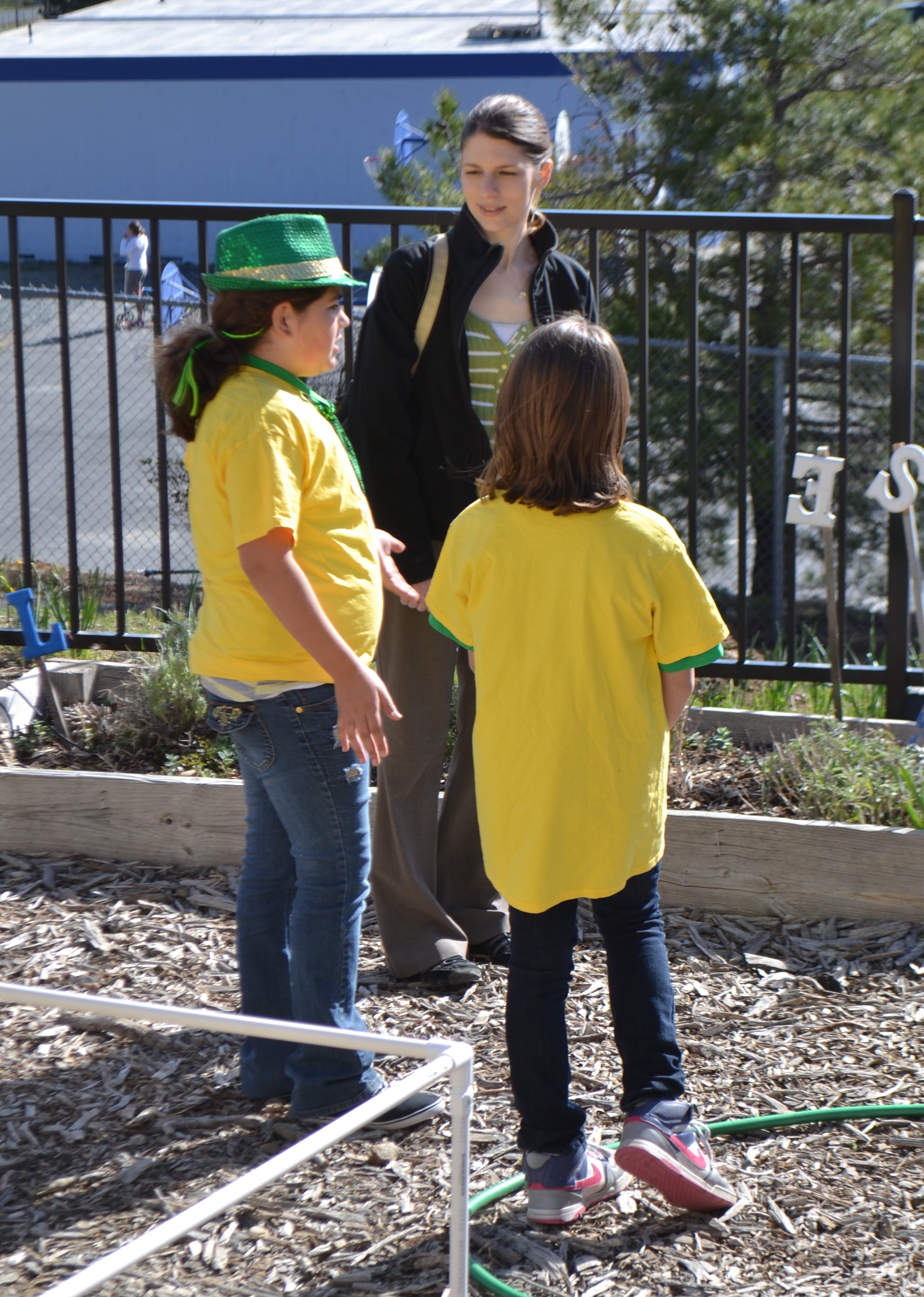 Pediatric residents from UCSD do part of their community health rotation at our district, through Pathways.  Garden Ambassadors, decked out in St. Patrick’s attire, give the doc a tour.