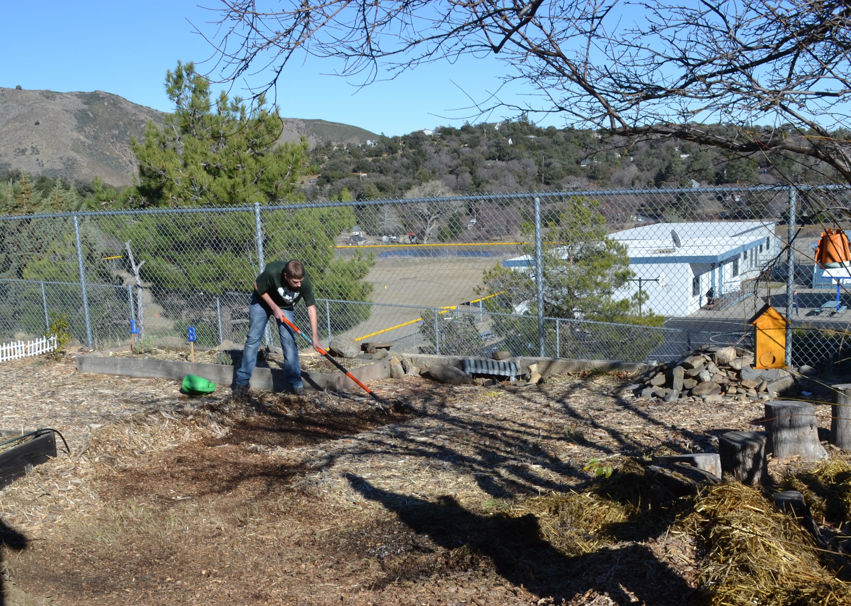 And now a third young man is getting ready to begin the construction phase of his project: to build a dry riverbed in order to direct rain runoff and beautify the north side of the garden. I should be able to post on the finished project soon. Here’s the “before,” as he’s raking away woodchips to mark out the riverbed’s footprint: