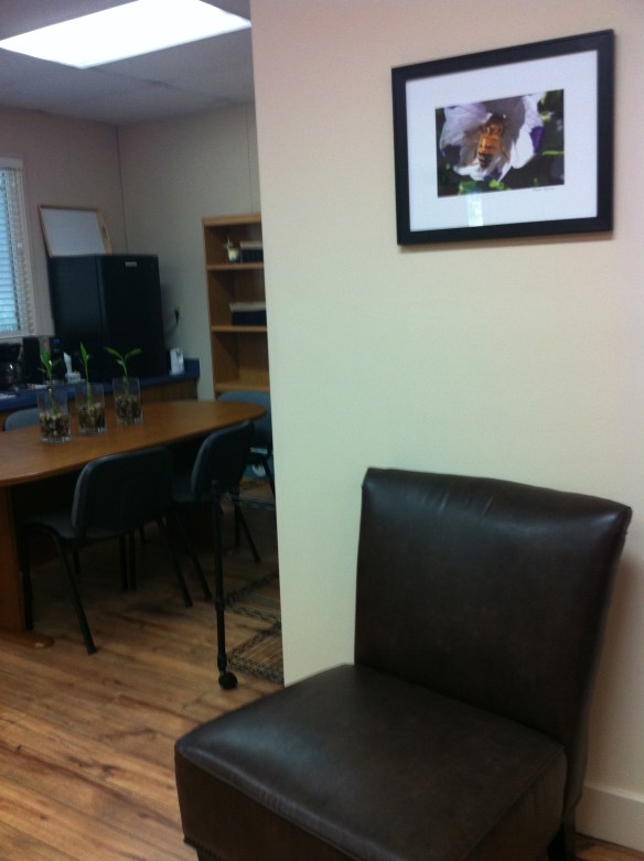 Hung with a group of floral photos is Trevor Denny’s close-up of a bee on a flower petal. Denny, who thinks “It’s pretty cool” to have his photo in a museum exhibition, never thought about how complex bees are until he examined one through the lense of this camera, focusing on details like the patterns in their wings and the hairs on their bodies.